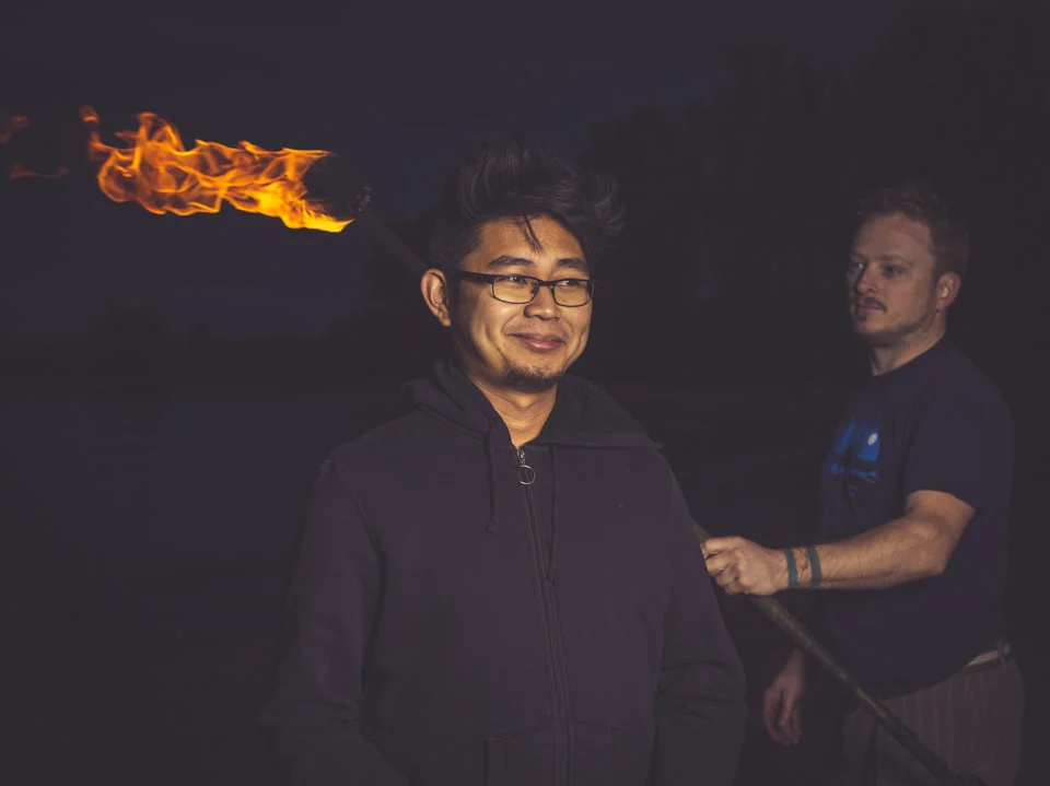 Brian de Rivera Simon with fire spinner and photographer, Andrew Miller